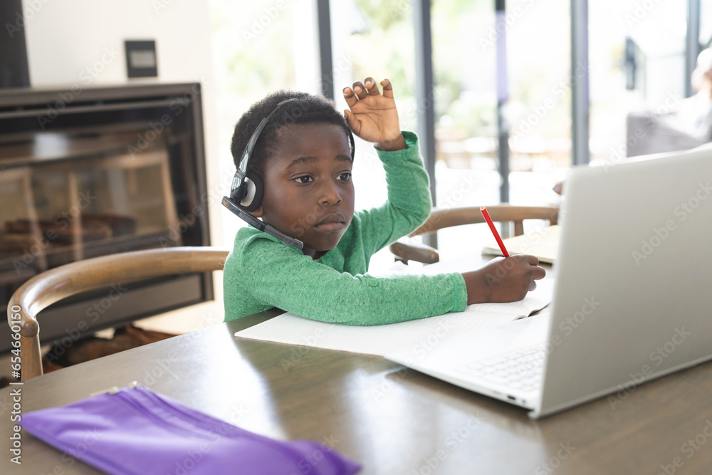 Obraz na plátně African american boy having online class using headphones and laptop with copy s