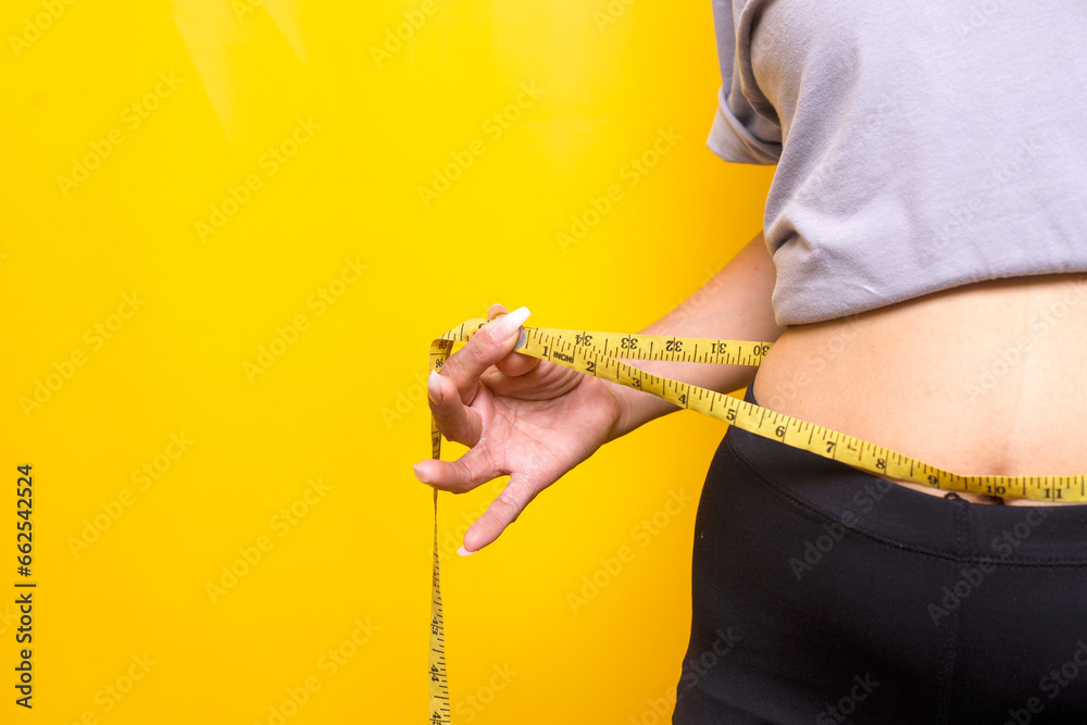 Obraz na plátně Woman measuring her waist using tape over yellow background