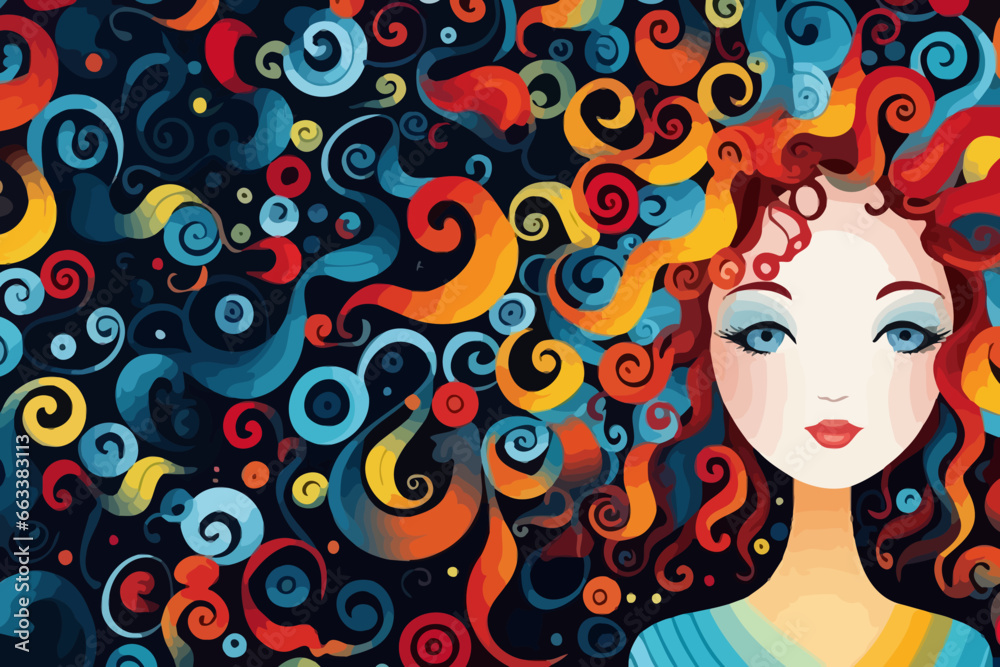 Obraz na plátně Curly hair quirky doodle pattern, wallpaper, background, cartoon, vector, whimsi
