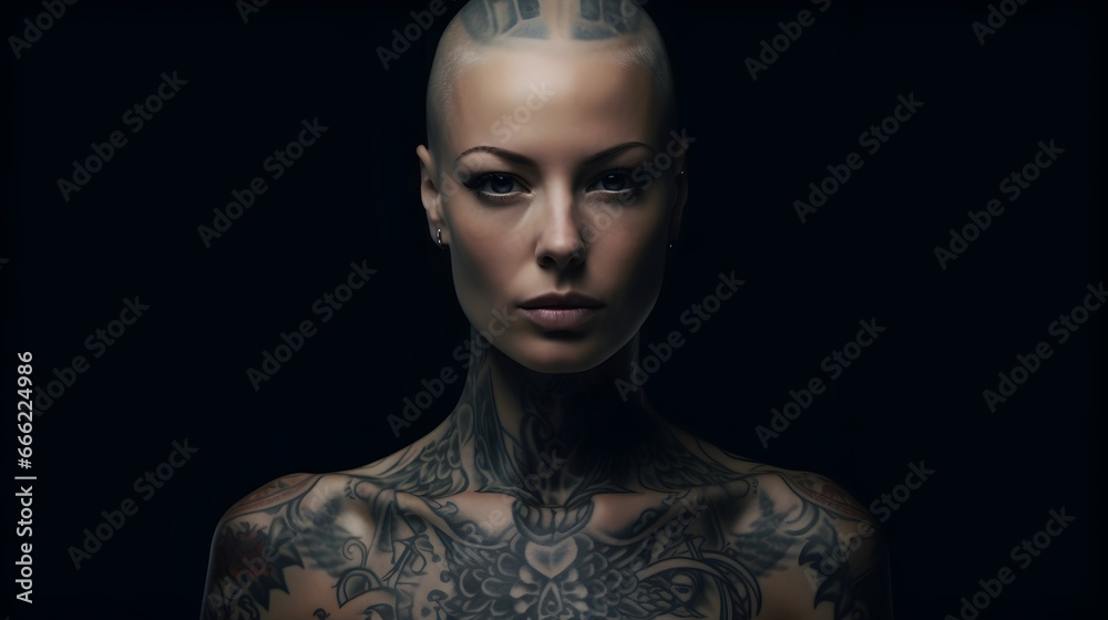 Obraz na plátně A portrait of a tattooed American woman with a bald head.
