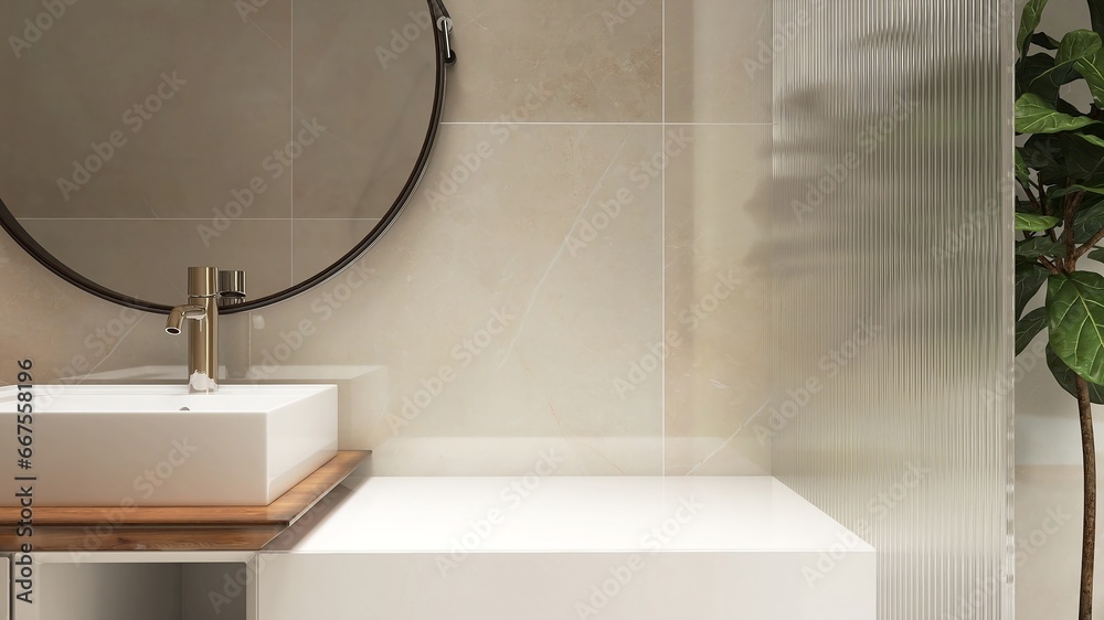 Obraz na plátně White vanity counter top, wash basin, chrome faucet, round mirror in sunlight sh