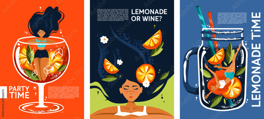 Obraz na plátně Stylish illustration of a woman, cocktail and lemonade