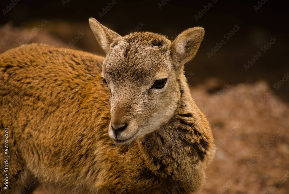 Obraz na plátně Close-up shot of a small mouflon looking around in a curious manner