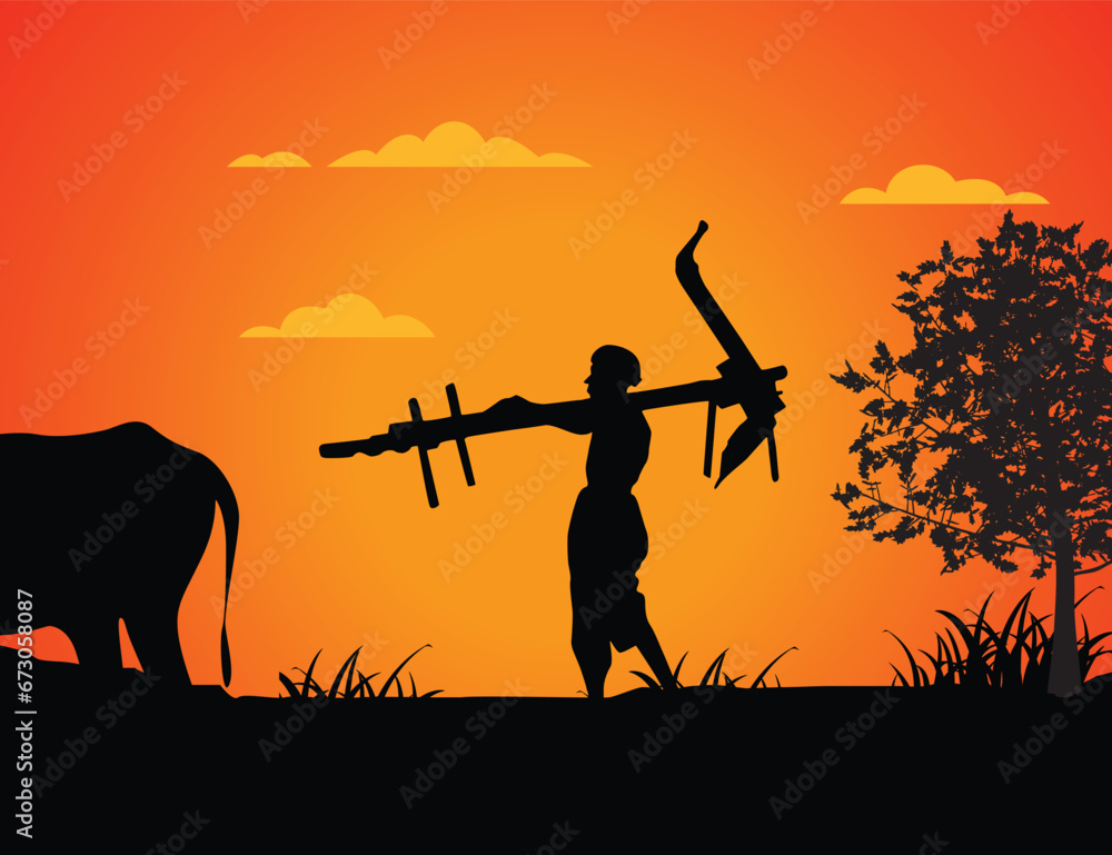Obraz na plátně A India farmer doing farming with plough, walking along with a bullock through t