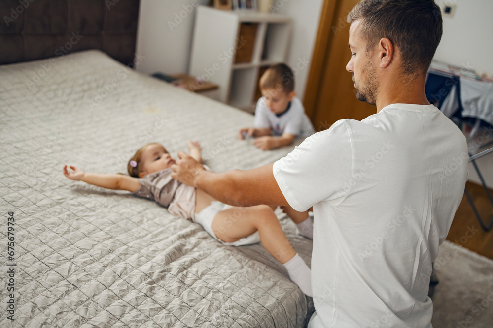 Obraz na plátně A father changing diaper while little girl is lying on the bed.