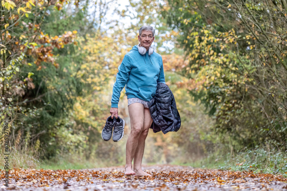 Obraz na plátně An elderly man walking lost and unoriented through a forest path, dementia conce
