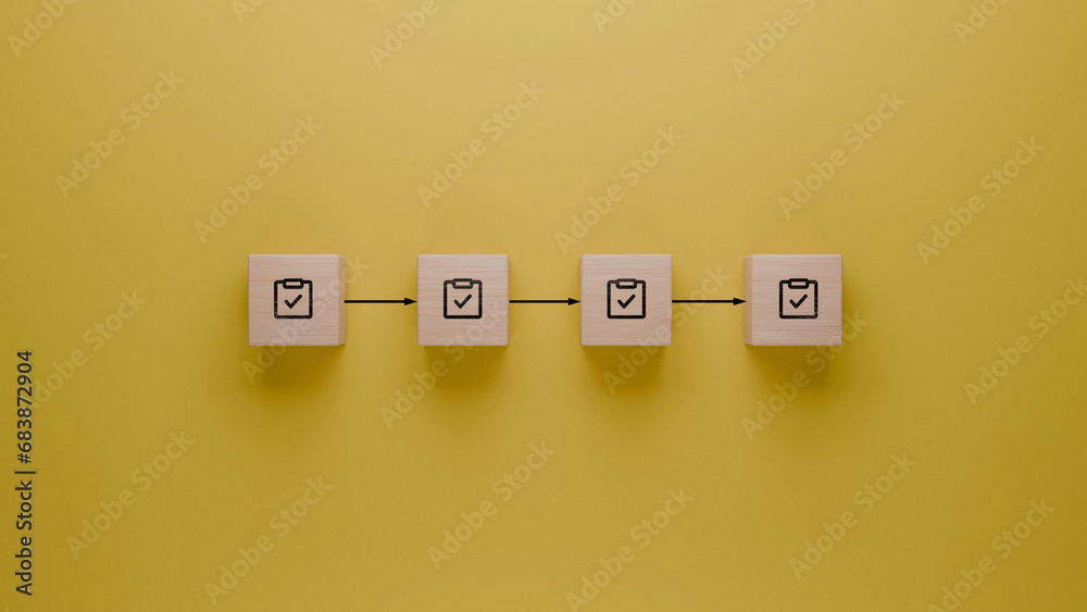 Obraz na plátně Task completion process with consecutive check mark symbols, stepwise project mi