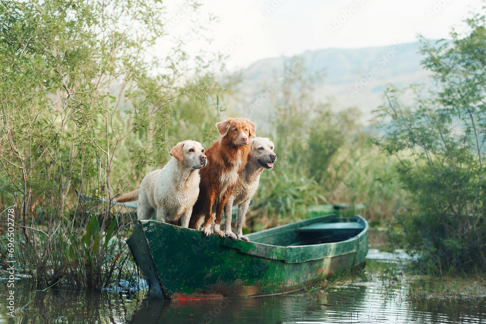 Obraz na plátně The Labrador and Nova Scotia Duck Tolling Retriever in boat, embarking on a river journey