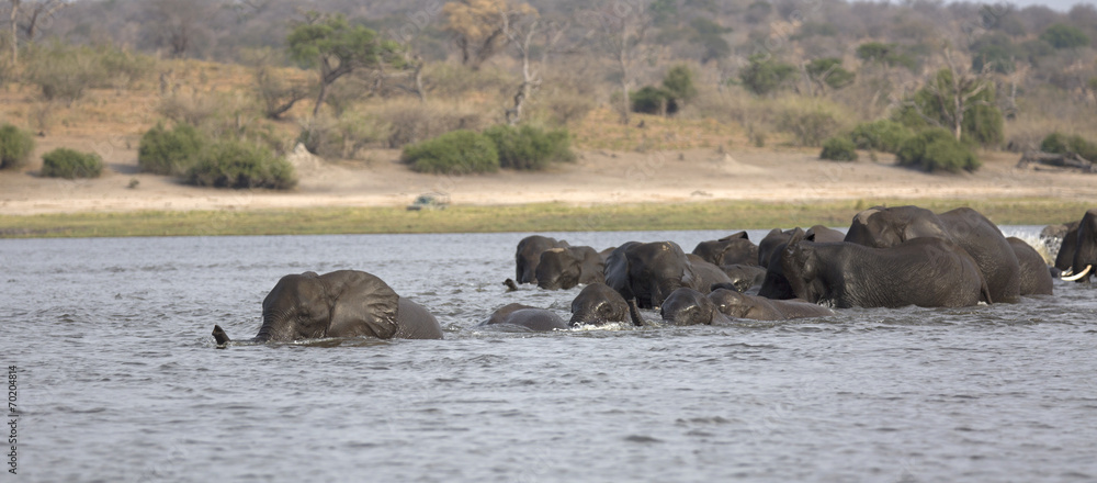 Obraz na plátně Wild african elephants swimming across a river