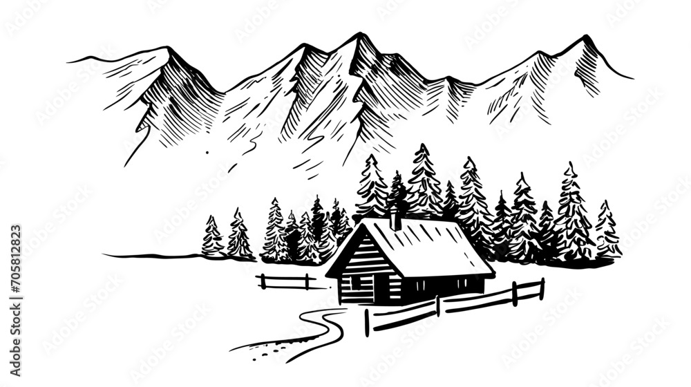Obraz na plátně Winter landscape sketch. Wood cabin landscape