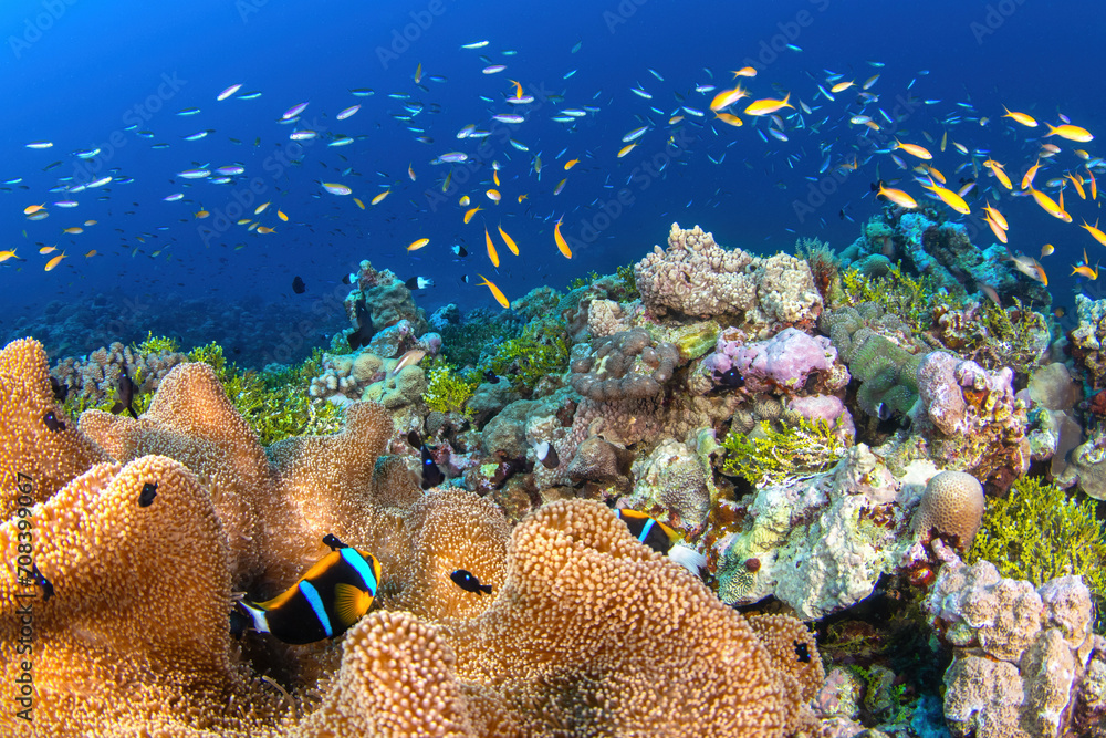 Obraz na plátně Reef scene with an anemonefish, sea anemone, corals and colourful tropical fish