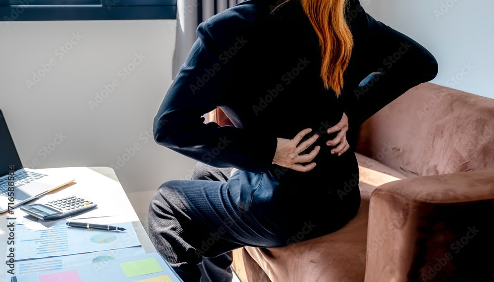 Obraz na plátně A successful businesswoman feeling waist pain and stretch herself after working