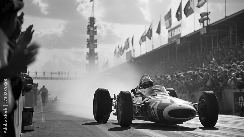 Obraz na plátně Vintage race cars speeding during a historic grand prix event, crowd cheering