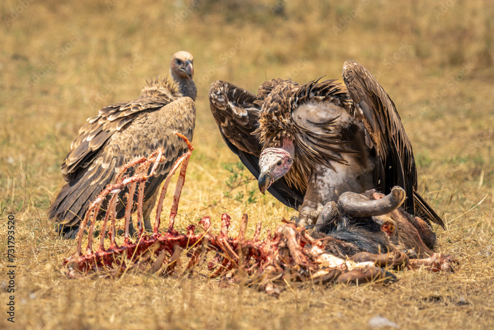 Obraz na plátně Lappet-faced and white-backed vultures with wildebeest carcase
