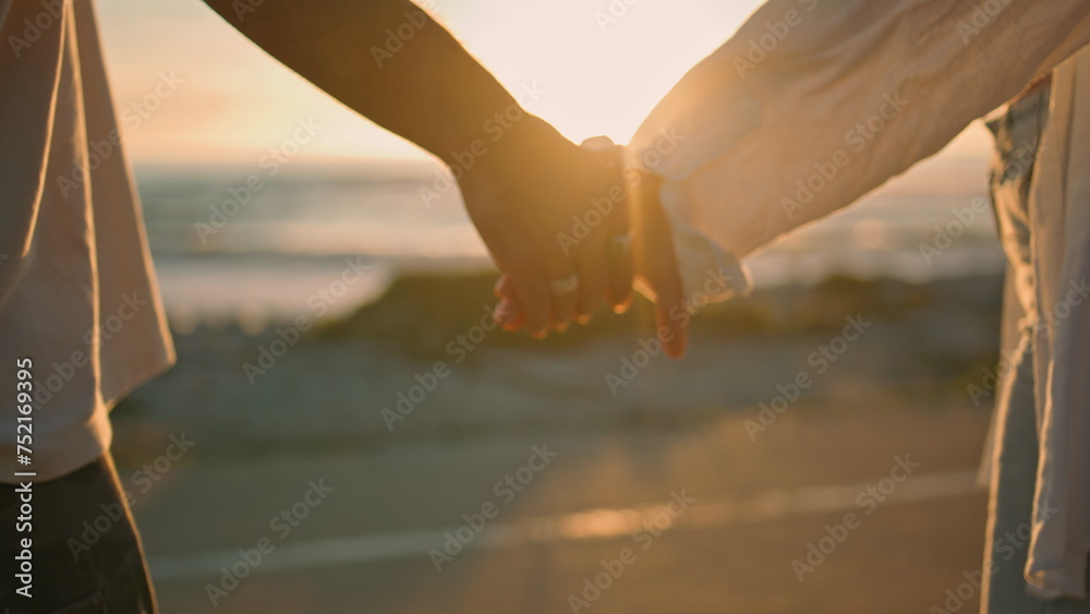 Obraz na plátně Dating lovers holding hands on sunrise sea beach close up