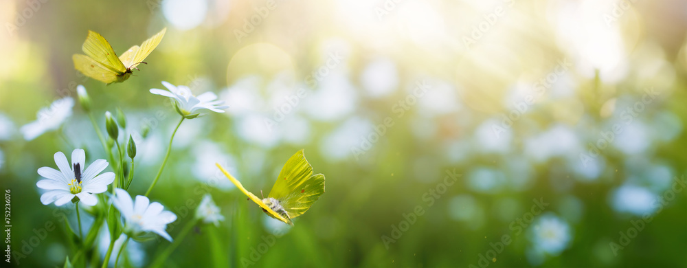 Obraz na plátně Spring or summer forest glade with flowering grass and butterflies on a sunny da
