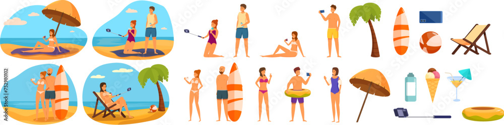 Obraz na plátně Selfie summer beach icons set cartoon vector