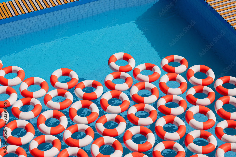 Obraz na plátně Overhead Array of Red and White Lifebuoys Floating in Vibrant Swimming Pool