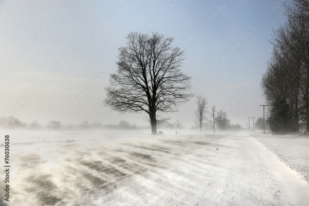 Obraz na plátně Drifting snow across the road. Winter landscape, Ontario, Canada