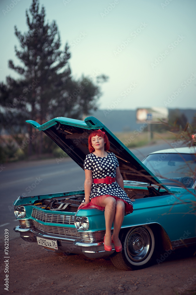 Obraz na plátně Retro girl sitting on blue Cadillac with opened hood