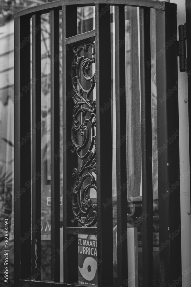 Obraz na plátně Intricate metal designs stand out against the straight lines of a black railing,
