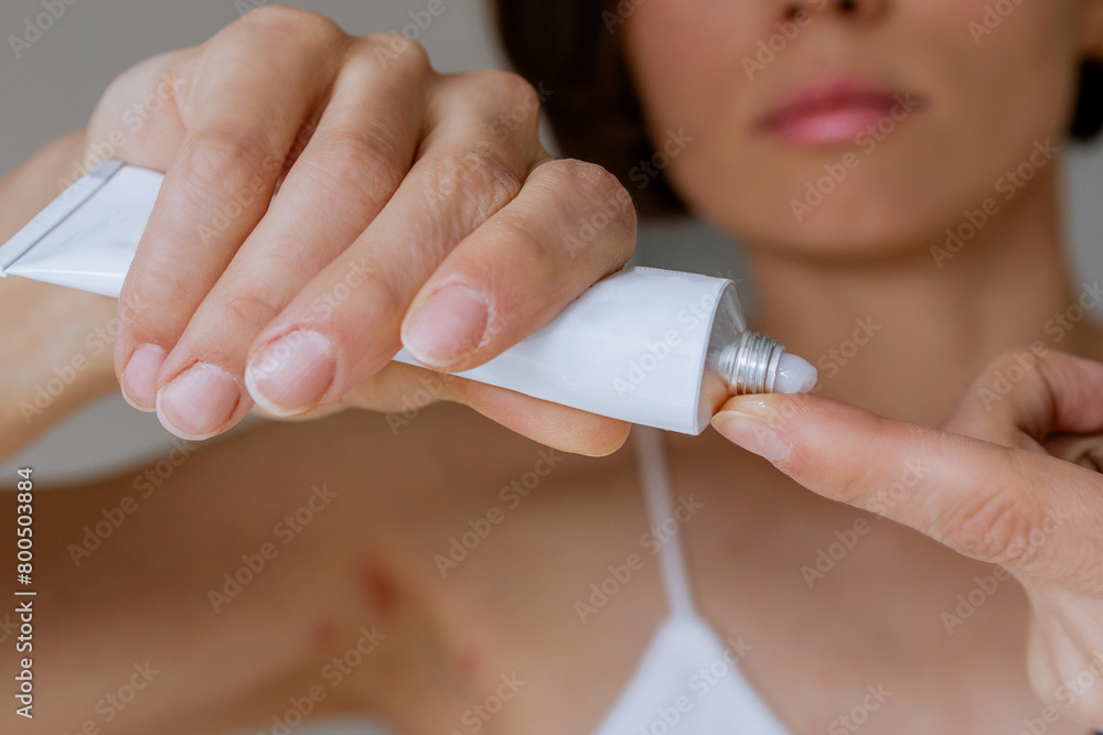 Obraz na plátně A woman presses the ointment onto her finger and applies it to the bite site by a bedbug on her shoulder on a white background, close-up