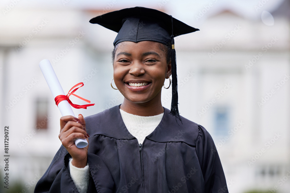 Obraz na plátně University, portrait or proud black woman at campus for graduation, event or phd, certificate or diploma success outdoor