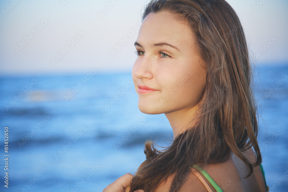 Obraz na plátně Brown-haired young girl on beach at summer evening