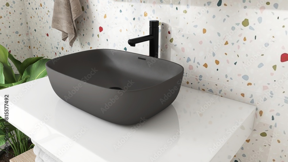 Obraz na plátně White vanity counter, black washbasin, cabinet, plant in sunlight on colorful te