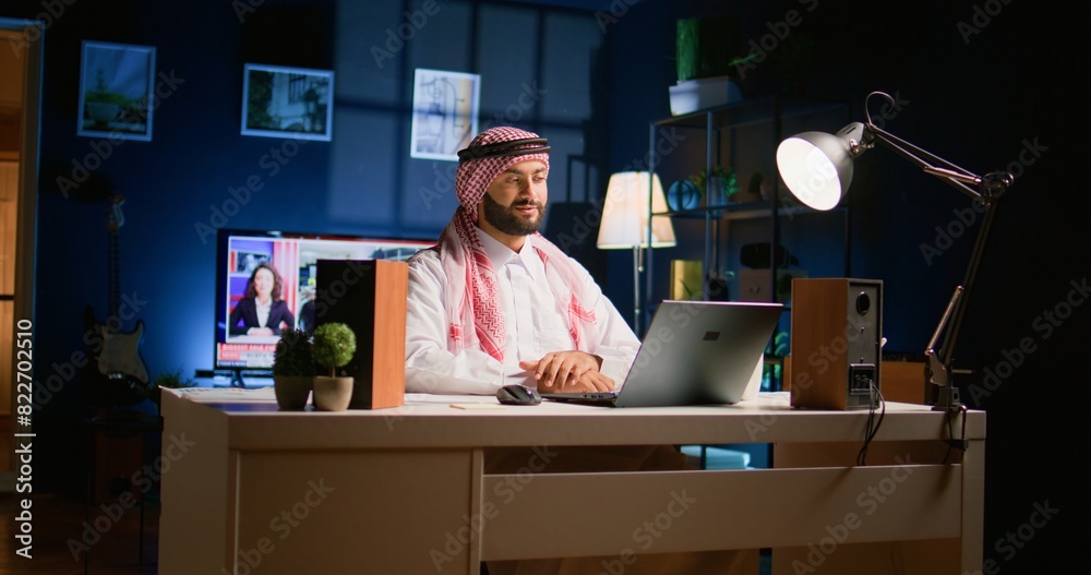 Obraz na plátně Arabic job candidate remotely being interviewed by human resources team while at home