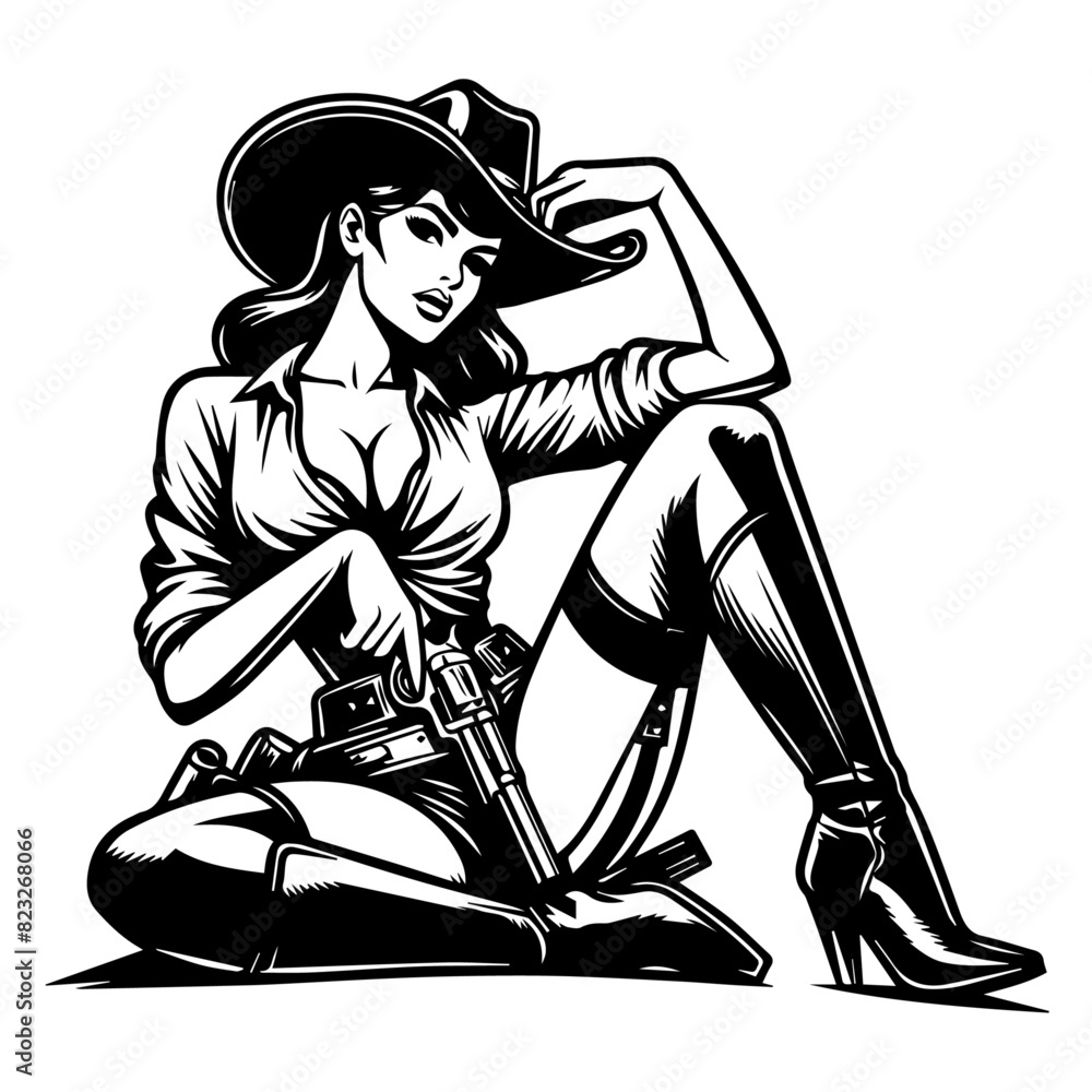 Obraz na plátně vintage pin-up cowgirl art in monochrome