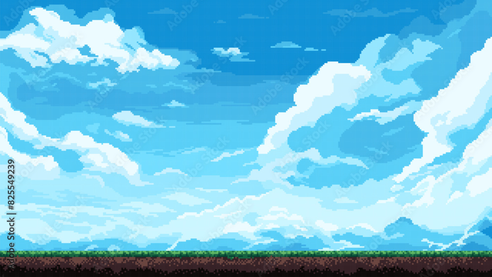 Obraz na plátně Pixel art sky background, clouds, blue sky, 8 bit game level, vector