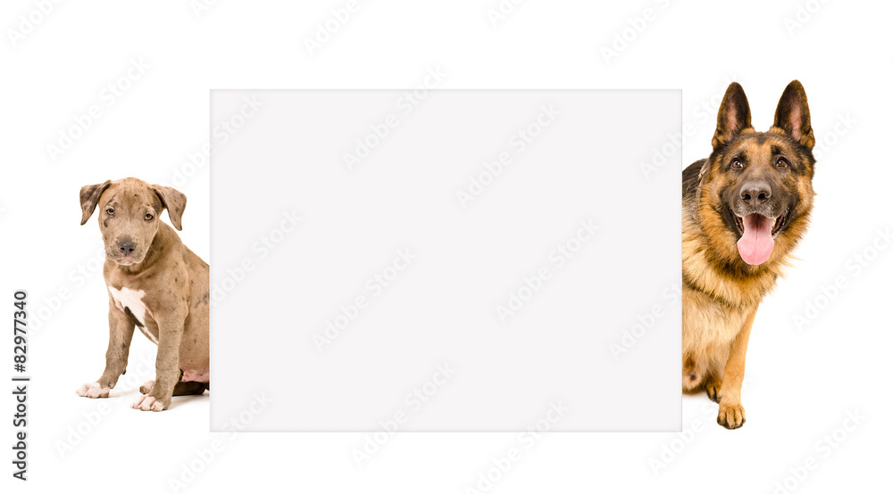 Obraz na plátně Puppy pit bull and a German Shepherd peeking from behind banner
