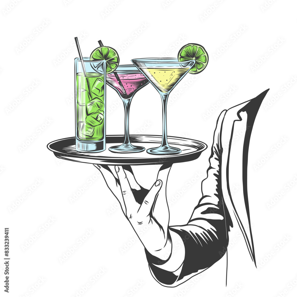 Obraz na plátně Waiter holding serving tray with cocktail glasses