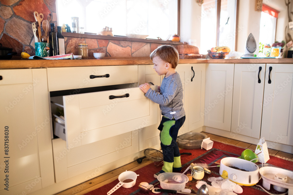 Obraz na plátně Little boy is taking kitchen utensils out of the drawers, making a mess in the kitchen
