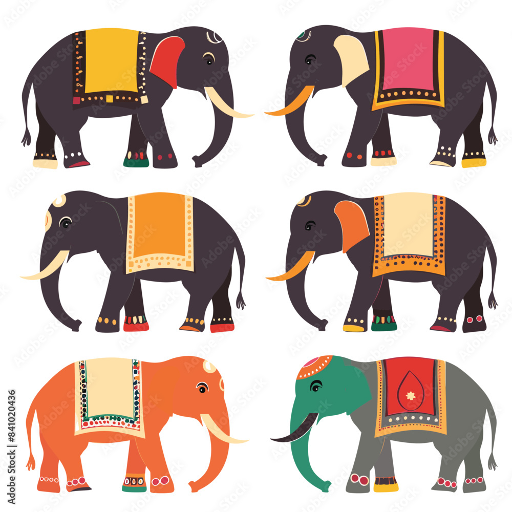 Obraz na plátně Colorful decorated elephants, flat design style, isolated white background