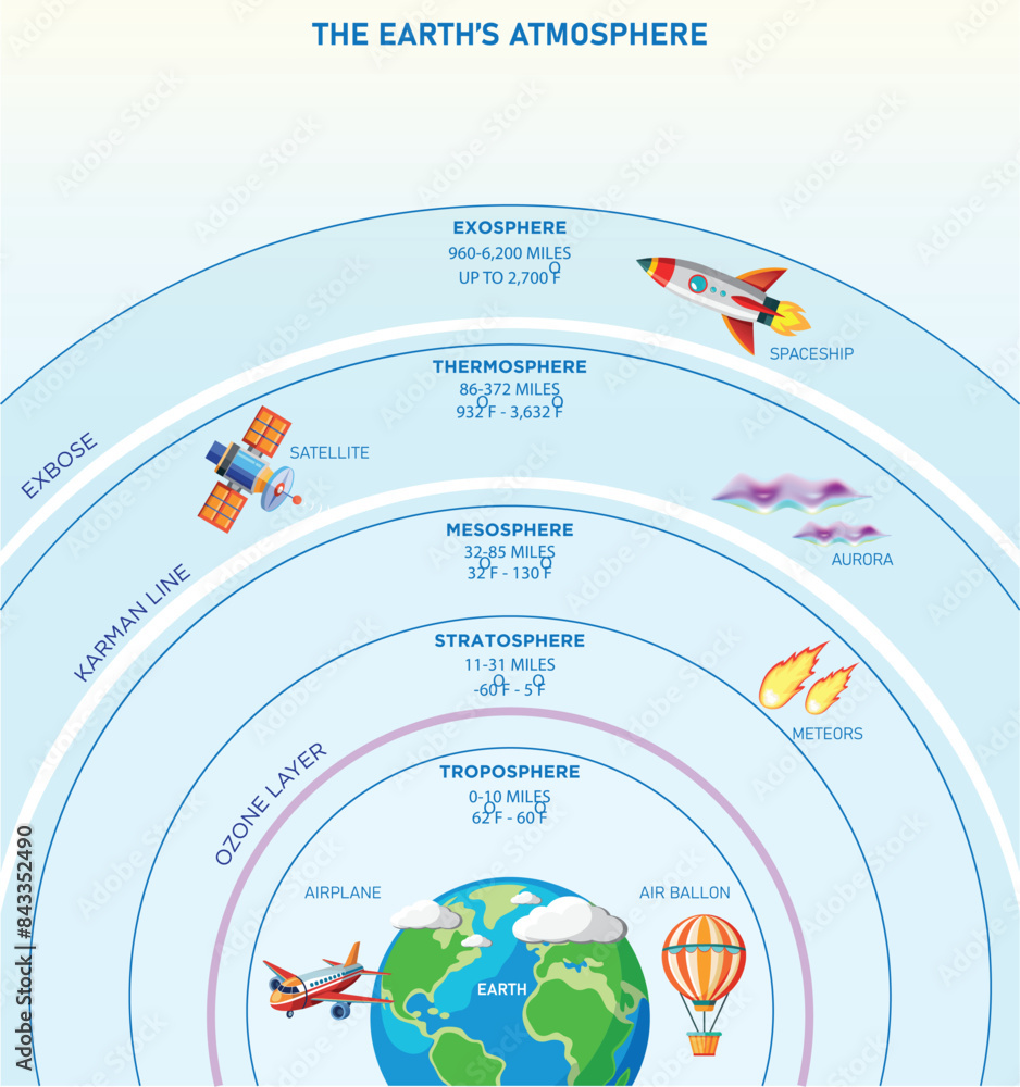 Obraz na plátně Earth's atmosphere consists of five layers, troposphere, stratosphere, mesosphere, thermosphere, and exosphere, each with distinct features