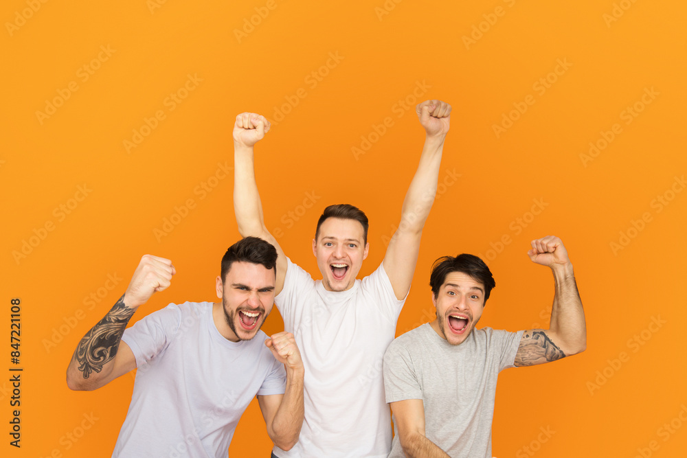 Obraz na plátně Three joyful men with raised arms celebrating a success or victory against an or