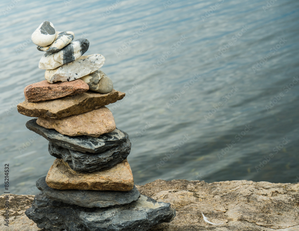 Obraz na plátně an iconic cairn on the shore of a lake creating a peaceful, spiritual moment to
