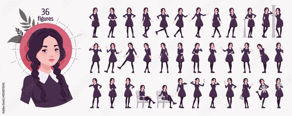 Obraz na plátně All black outfit pale girl, goth long sleeved dress character set, bundle, long pigtail braids, charm costume, cool uniform look poses, emotion, life mood, diverse life situations