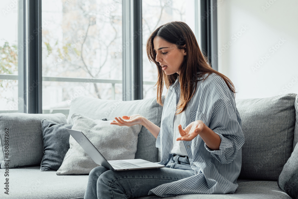 Obraz na plátně Angry young woman sit on sofa in living room frustrated having operational problems working on laptop, mad millennial girl feel stressed confused with slow internet connection or computer spam