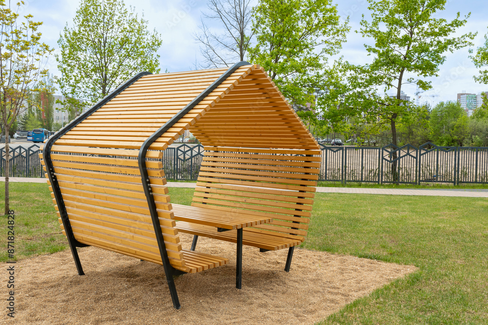 Obraz na plátně wooden gazebo or pavilion with benches and a table in a public park