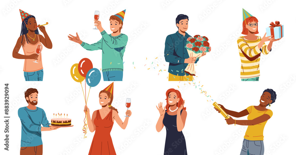 Obraz na plátně Birthday party diverse guests flat color vector icon set
