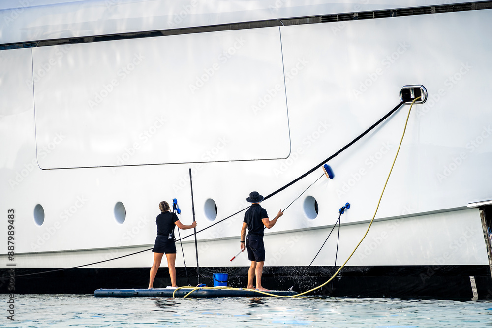 Obraz na plátně Super yacht crew, two deckhands, male and female cleaning the side of a white me