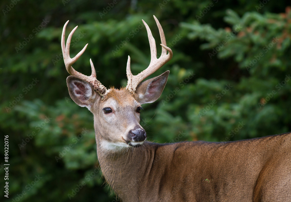 Obraz na plátně Closeup of majestic whitetail deer buck framed by dense forest.