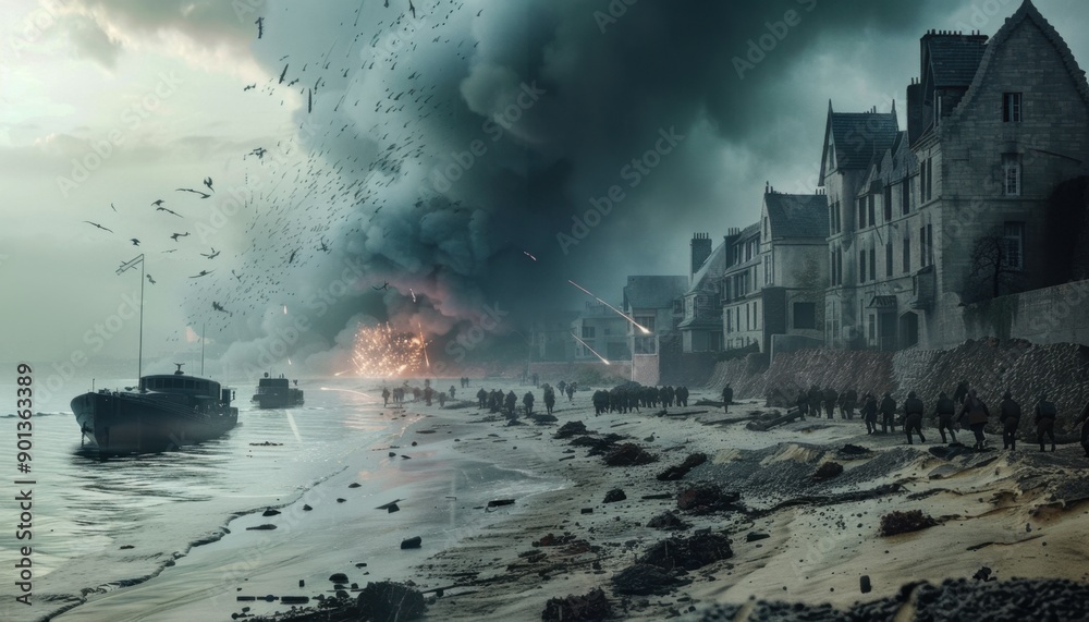 Obraz na plátně Soldiers Advance on a French Beach During a Bombardment