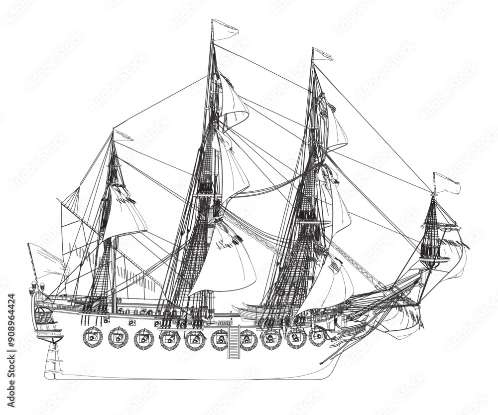Obraz na plátně Outline of an ancient sailing frigate made of black lines isolated on a white background