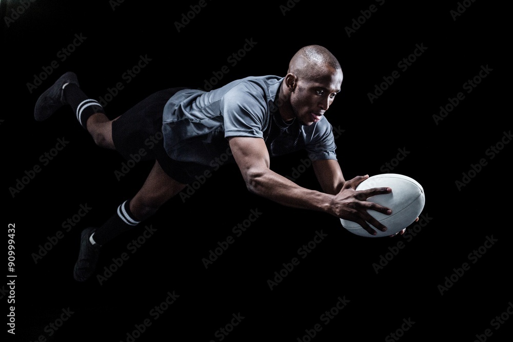 Obraz na plátně Sportsman jumping for catching rugby ball