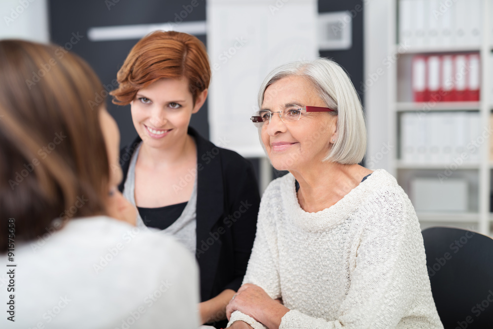 Obraz na plátně drei frauen verschiedenen alters unterhalten sich am arbeitsplatz
