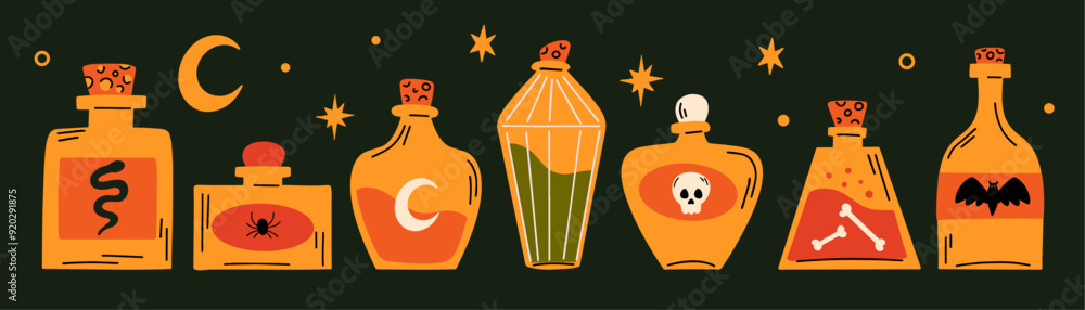Obraz na plátně Halloween concept spooky vector illustration set, cartoon potion glass corked bo